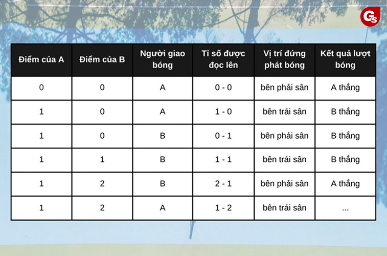 Hai bên sẽ đánh bóng qua lại, nếu người phát bóng đầu tiên đội B không đỡ được bóng thì người đó đã mất lượt phát bóng. Và giờ đây, quyền giao bóng thuộc về thành viên còn lại của đội B, người đó sẽ hô là 0, 1, 2, tức là điểm đội tôi là 0 điểm, điểm đối phương là 1 điểm và tôi là người giao bóng thứ hai trong đội của tôi.