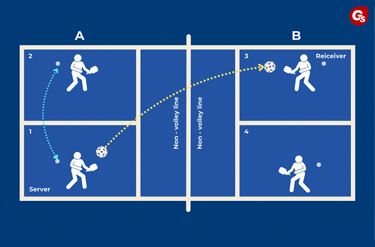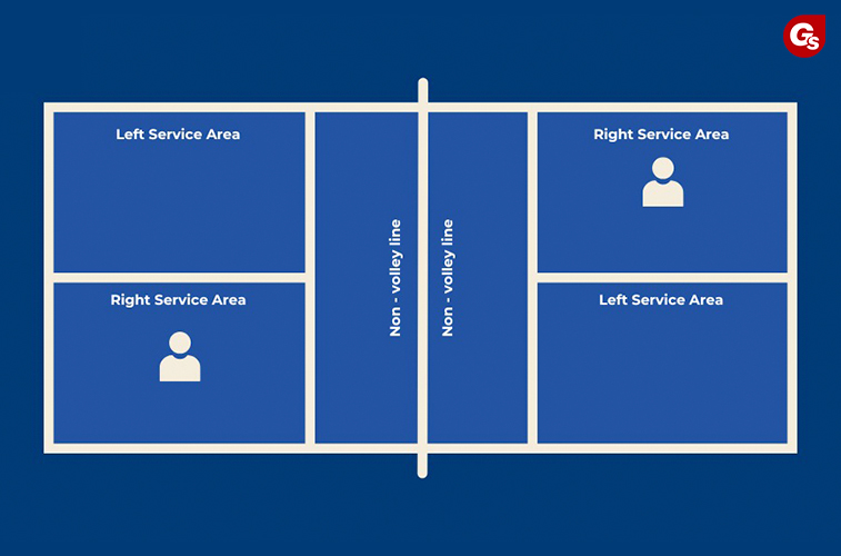 Người chơi ở ô giao bóng bên phải sẽ thực hiện cú giao bóng đầu tiên và bóng được đánh chéo chéo về phía sân đối thủ.