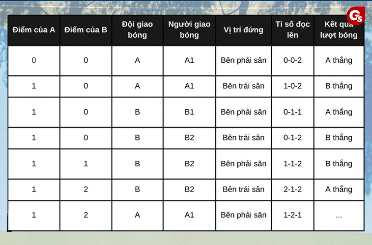 Nếu đối thủ ghi điểm, đối thủ vẫn có quyền giao bóng. Điểm đối thủ là 1 điểm, số lẻ nên sẽ di chuyển sang bên trái sân họ để giao bóng. Trước khi giao sẽ hô 1-2, tức đối thủ 1 điểm, bạn có 2 điểm.