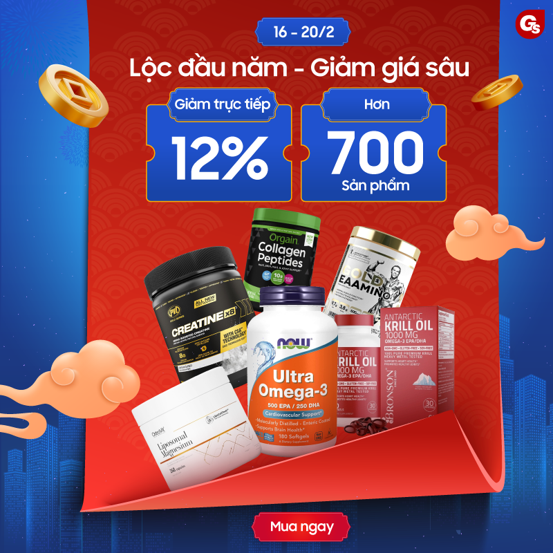 Chương trình LỘC ĐẦU NĂM - GIẢM GIÁ SÂU giảm trực tiếp 12% trên hơn 700 sản phẩm (ngoại trừ Whey Protein và Mass Gainer có mức chiết khấu đặc biệt cho năm 2024) khi mua hàng qua Website từ ngày 16 - 20/2.