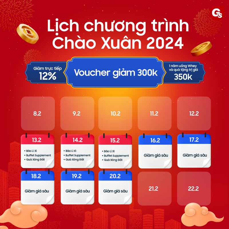 Rước lộc đầu xuân, cả năm may mắn, nhận ngay voucher khủng cùng nhiều quà tặng khi mua hàng trên website và trực tiếp tại hệ thống Gymstore từ ngày 13/2 - 20/2. Cụ thể:
