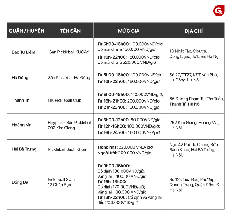Bảng tổng hợp giá thuê sân Pickleball Hà Nội tại một số quận huyện như sau: