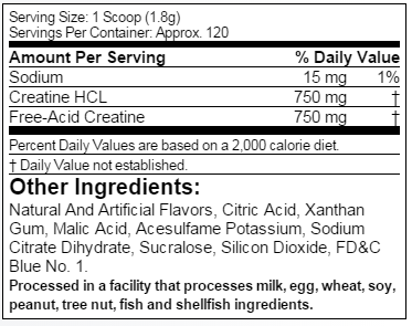 | Thành phần | Creatine HCL, Free-Acid Creatine |