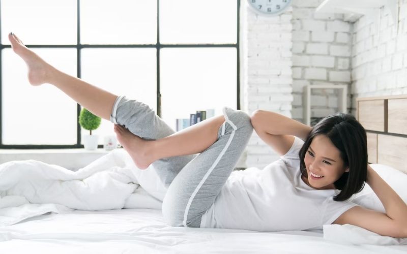 Bài tập giảm mỡ bụng trên giường trước khi ngủ kết hợp nâng hông và duỗi chân