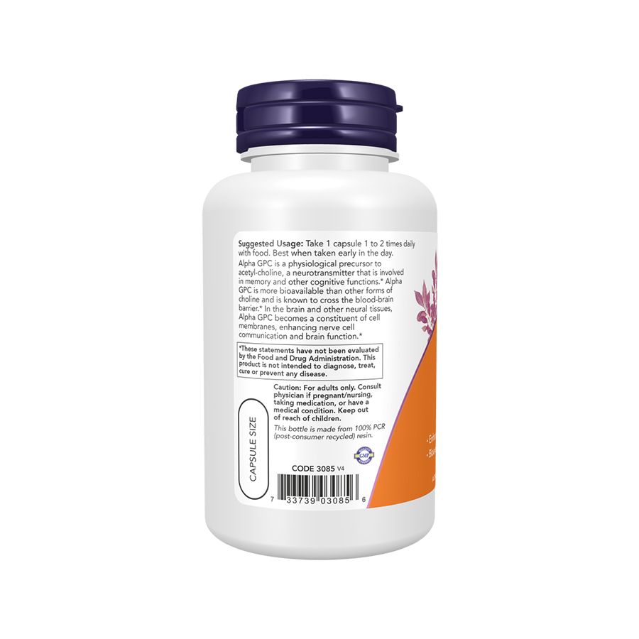 Other Ingredients: Mannitol, Hypromellose (cellulose capsule), Microcrystalline Cellulose, Silicon Dioxide, Stearic Acid (vegetable source) and Magnesium Stearate (vegetable source). Alpha GPC from soy lecithin (highly refined). Not manufactured with yeast, wheat, gluten, milk, egg, fish, shellfish, tree nut or sesame ingredients. Produced in a GMP facility that processes other ingredients containing these allergens. Caution: For adults only. Consult physician if pregnant/nursing, taking medication, or have a medical condition. Keep out of reach of children. Natural color variation may occur in this product. Made and quality tested in the USA with globally sourced ingredients. Store in a cool, dry place after opening. Family owned since 1968. This bottle is made from 100% PCR (post-consumer recycled) resin. |