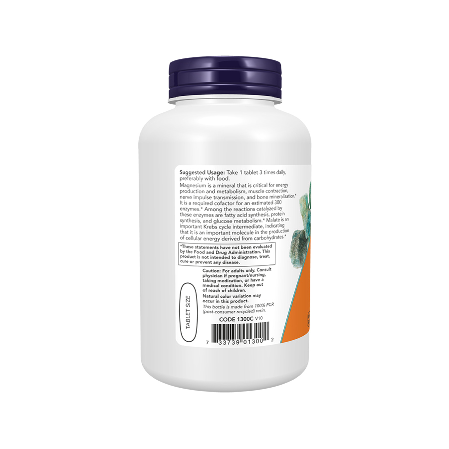 Other Ingredients: Hydroxypropyl Cellulose, Microcrystalline Cellulose, Stearic Acid (vegetable source), Croscarmellose Sodium, Magnesium Stearate (vegetable source), Silicon Dioxide and Vegetarian Coating [hypromellose (cellulose), calcium carbonate, glycerin]. Not manufactured with wheat, gluten, soy, milk, egg, fish, shellfish or sesame ingredients. Produced in a GMP facility that processes other ingredients containing these allergens. Caution: For adults only. Consult physician if pregnant/nursing, taking medication, or have a medical condition. Keep out of reach of children. NOW® Magnesium Malate is a fully reacted mineral supplement. Natural color variation may occur in this product. Made and quality tested in the USA with globally sourced ingredients. Store in a cool, dry place after opening. Family owned since 1968. This bottle is made from 100% PCR (post-consumer recycled) resin. |