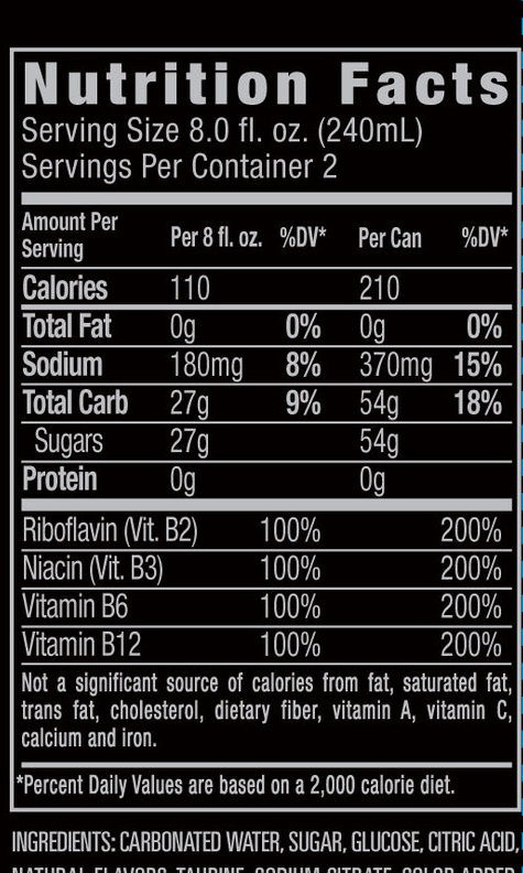 48 calo, Taurine, L-Carnitine, Caffeine, rễ nhân sâm, vitamin B |