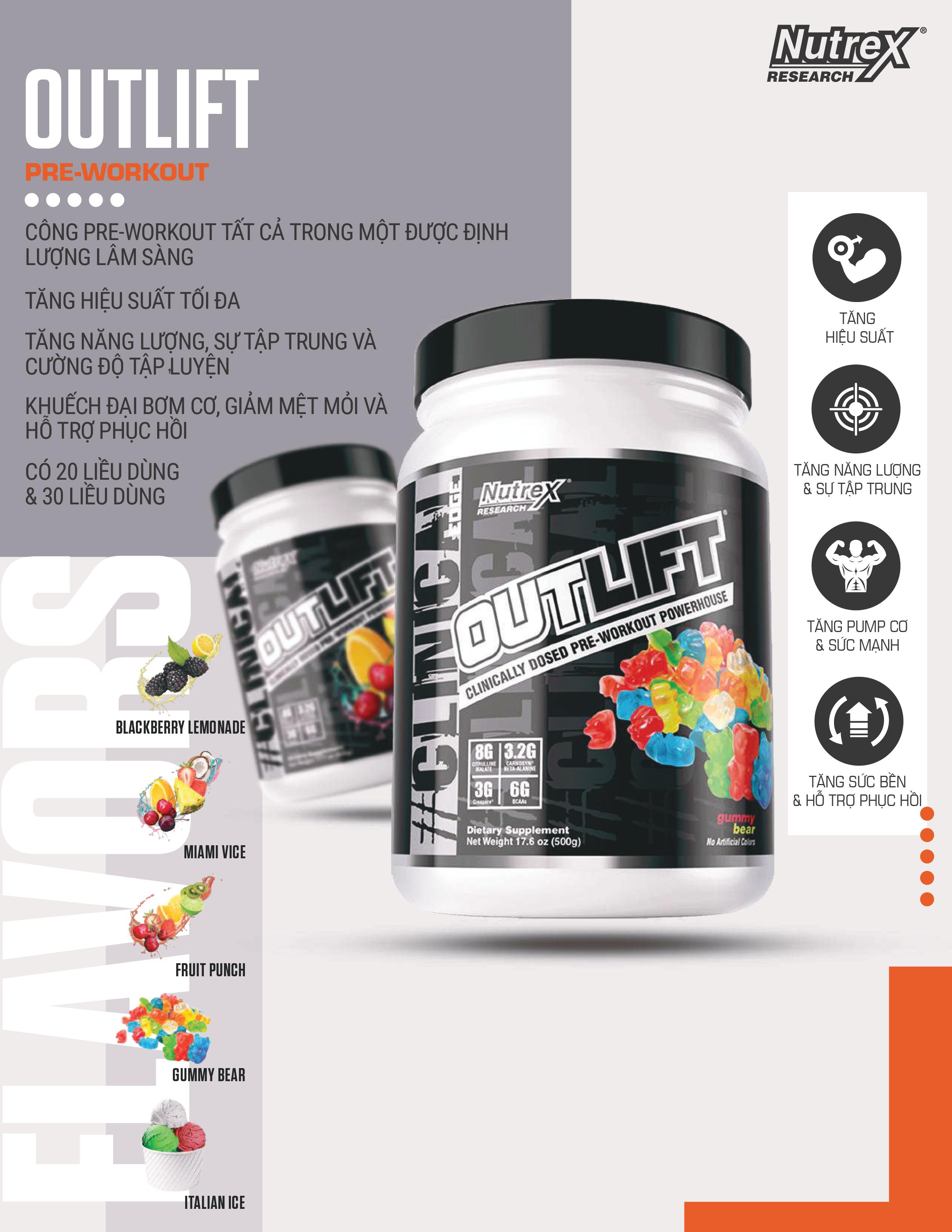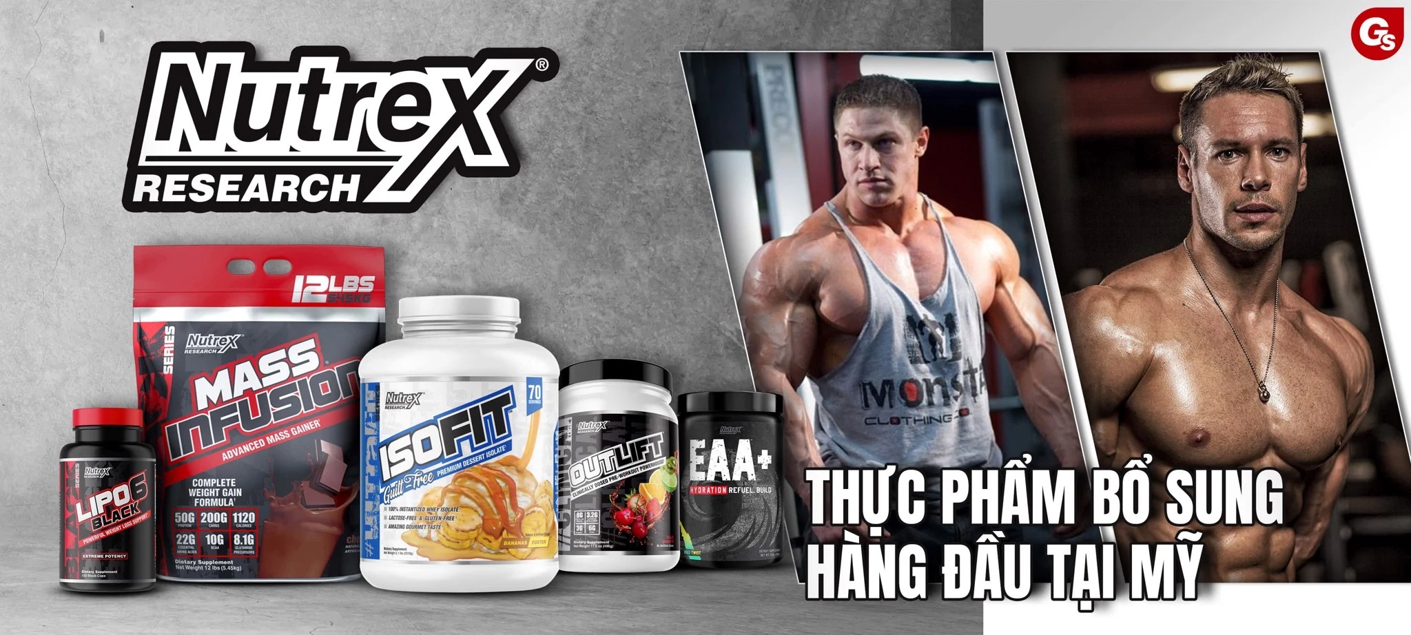 Với thương hiệu Nutrex, Gymstore Việt Nam phát triển tập trung nhánh đốt mỡ, fat burner và pre-workout làm xương sống phát triển, chủ lực với sản phẩm Pre Workout OUTLIFT được đánh giá là 1 trong những loại pre-workout mạnh nhất và đáng xài nhất hiện nay, đại gia đình fat burner bất khả chiến bại LIPO với các đại diện như: Lipo 6 black, Lipo RX, Lipo Stim free, bên cạnh đó có các vệ tinh hỗ trợ giảm mỡ quen thuộc như CLA và L-Carnitine, bên cạnh đó chúng tôi cũng có thêm Glutamin và Creatine để hỗ trợ phát triển cơ bắp, sức mạnh và phục hồi sức khỏe.