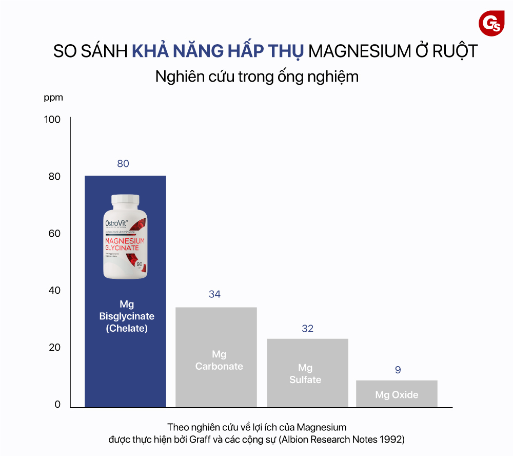 Tuy nhiên, vì nó có gắn hai phân tử glycine nên nó được gọi chính xác hơn là “bisglycinate” (bis = hai). Chính cấu trúc này tăng khả năng hòa tan và dẫn đến khả năng hấp thụ vượt trội hơn. Một nghiên cứu cho thấy magiê bisglycinate có khả năng duy trì nồng độ magiê trong huyết thanh trong 8 giờ, tiếp theo là dimagnesium malate; hấp thụ ít nhất là magiê oxit.