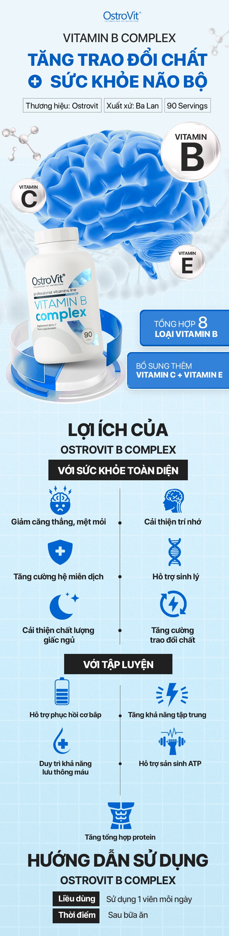 Ostrovit Vitamin B Complex là sản phẩm cung cấp đầy đủ 8 loại Vitamin B khác nhau hỗ trợ thúc đẩy trao đổi chất, cải thiện sức khỏe toàn diện và hiệu suất tập luyện.