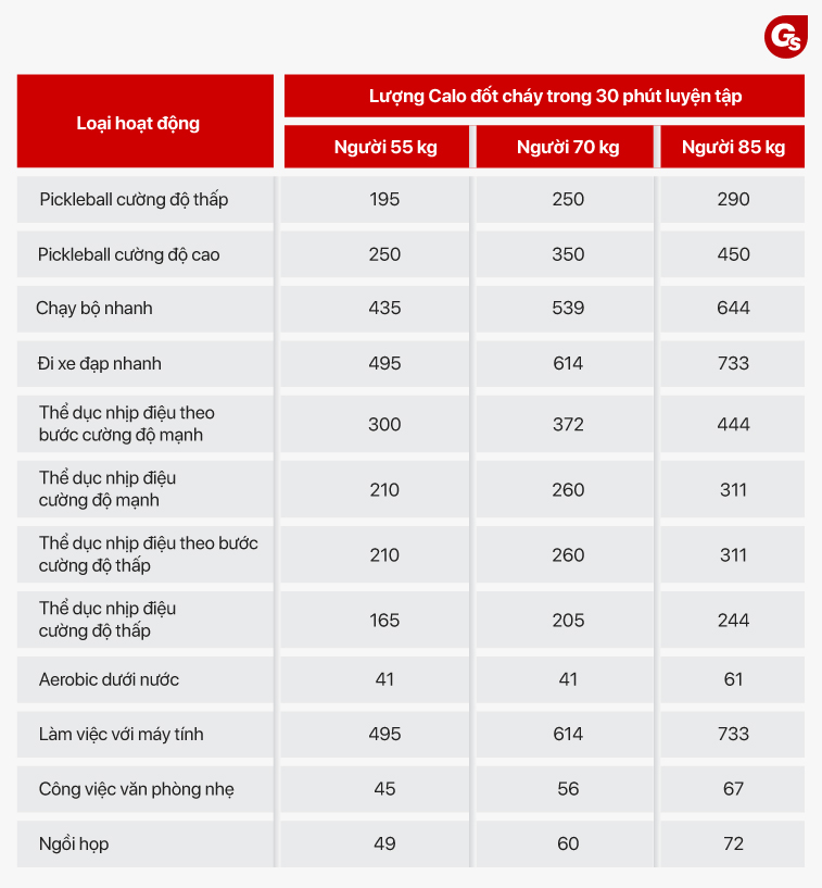 Như đã nói ở mục 4, chơi Pickleball giống như các bạn đang thực hiện bài tập Aerobic tổng hợp. Dành cho những ai đang muốn tìm hiểu Chơi Pickleball đốt bao nhiêu calo và so sánh với các hoạt động thể thao khác thì Gymstore xin gửi các bạn bảng sau: