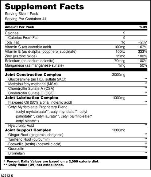 | Thành phần chính | Glucosamine, MSM, Chondroitin, Hyaluronic Acid,... Vitamin C, E, kẽm, mangan, selen. Dầu hạt lanh, rễ gừng, rễ nghệ,... |