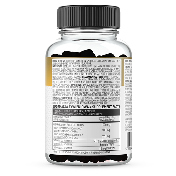 OstroVit Omega 3 D3 + K2 là một Thực phẩm bổ sung 3 trong 1 được chiết xuất dưới dạng viên nang mềm, có chứa axit béo omega 3 (EPA và DHA) và vitamin D3, K2, cũng như D-alpha-tocopherol tức là Vitamin E.