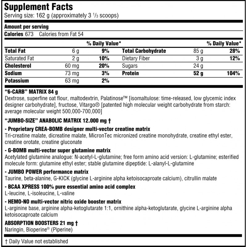 JUMBO có nghĩa TO LỚN! JUMBO có nghĩa MẠNH MẼ! "JUMBO ban đầu đã được phát triển để giúp những người gặp khó khăn trong việc chuyển hóa chất dinh dưỡng, hoặc những người có nhu cầu năng lượng cực đoan do mức độ hoạt động của họ. Sự phổ biến của JUMBO - bắt nguồn từ chất lượng và kết quả của nó - đảm bảo rằng với sự phát triển của một công thức cụ thể cho sự chuyển hóa bình thường và khỏe mạnh hơn, và cho các vận động viên thể hình. Và rồi thành viên thứ hai của gia đình JUMBO, JUMBO PROFESSIONAL ra đời