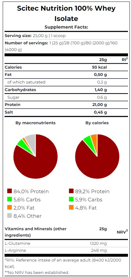 Scitec 100% Whey Isolate là một sản phẩm với chất lượng tuyệt vời từ Whey đậm đặc và bổ sung thêm hấp thu Whey Hydrolysate. Công thức này giúp giảm bớt lượng carbohydrate hơn bao giờ hết! Nói chung whey protein đậm đặc được sản xuất để có một tỷ lệ phần trăm protein cao hơn Whey "cô đặc", có nghĩa là sẽ có lượng đường thấp hơn (bao gồm cả lactose) và hàm lượng chất béo cũng thấp hơn đáng kể! Chế độ ăn uống là nguồn gốc của nitơ và các axit amin thiết yếu, cơ thể cần đến sự tăng trưởng và duy trì các mô. Do đó Scitec 100% Whey Isolate sẽ góp phần đóng góp to lớn vào sự phát triển và duy trì khối lượng cơ, và cũng để duy trì xương khớp hoạt động bình thường.