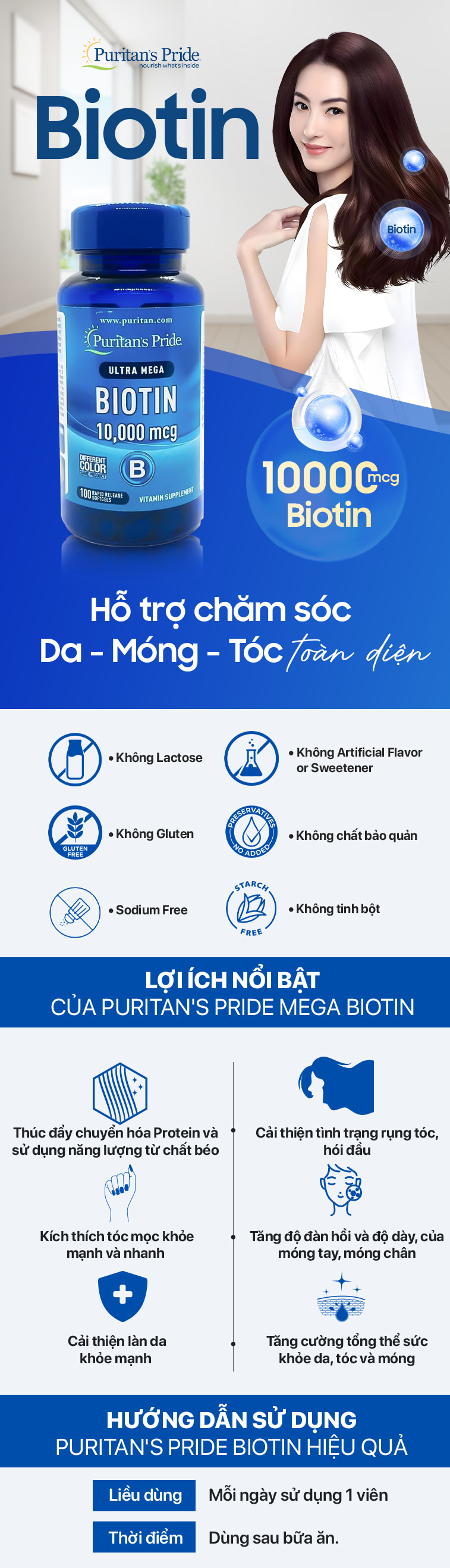 Puritan's Pride Biotin là một sản phẩm bổ sung vitamin cần thiết để làm đẹp ở những người phụ nữ có móng tay giòn, yếu và đặc biệt có sự cải thiện đối với phụ nữ có tình trạng thiếu hụt Biotin trầm trọng dẫn đến việc gãy rụng tóc thường xuyên.