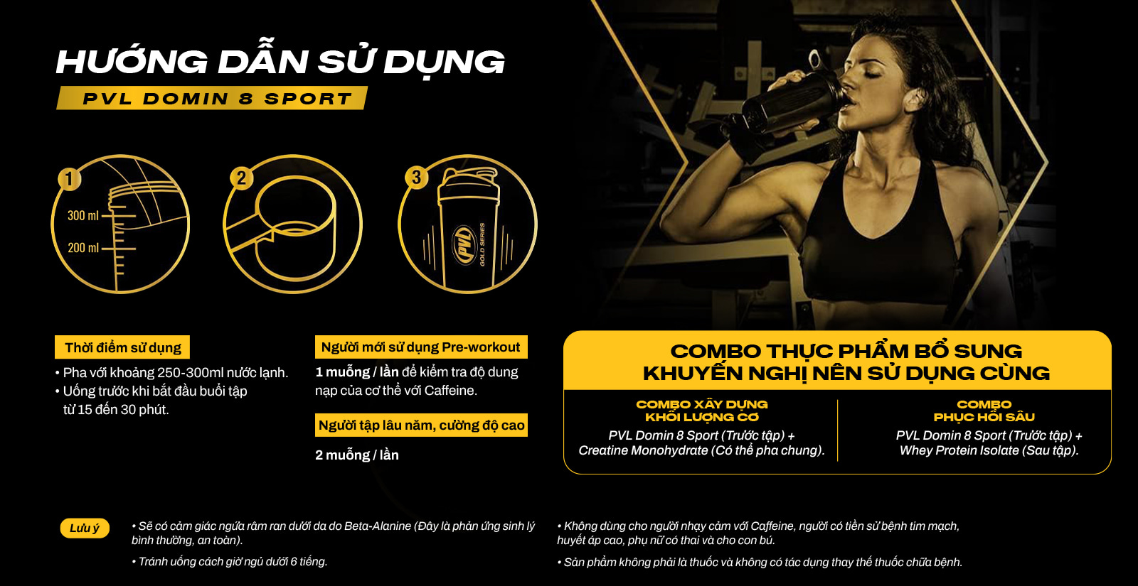Combo xây dựng khối lượng cơ: PVL Domin 8 Sport (Trước tập) + Creatine Monohydrate (Có thể pha chung).