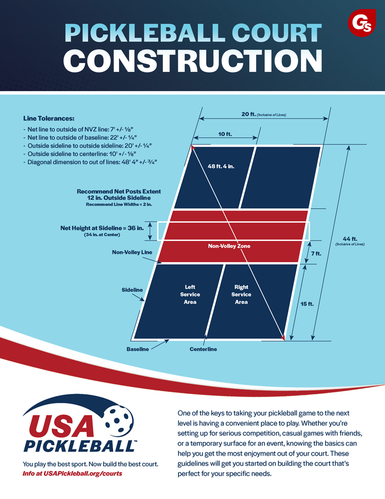 • Sân Pickleball hình chữ nhật, được chia thành hai bên bằng nhau bằng lưới ở giữa sân. Sân có chiều dài 13.4112 m (44 feet tính từ phía sau mỗi đường biên cuối sân) và chiều rộng là 6.1 m (20 feet).