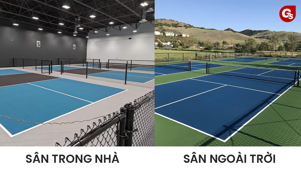 Bên cạnh số lượng người chơi, sân pickleball còn được chia theo vị trí, cụ thể là sân trong nhà và sân ngoài trời. Hai loại sân này giống nhau về kích thước và luật chơi nhưng vẫn có một số đặc điểm khác nhau.