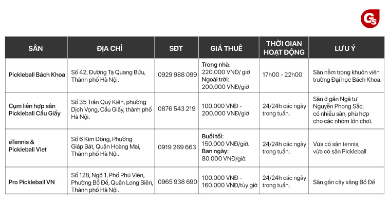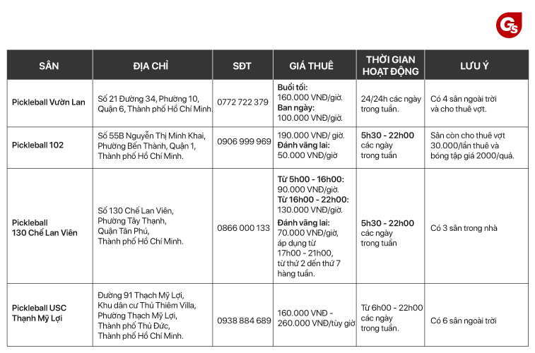 Khi chơi Pickleball, tìm hiểu sân Pickleball uy tín, giá tốt, chất lượng cũng là mối quan tâm của nhiều người, Gymstore tổng hợp một số địa chỉ chơi gửi các bạn tham khảo: