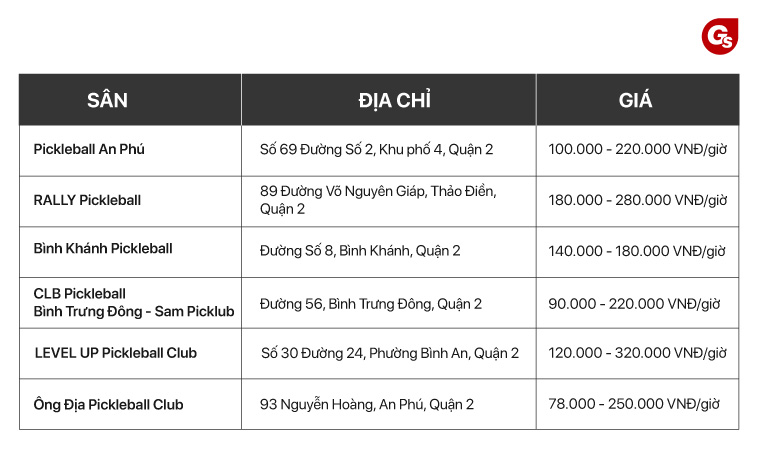 Cùng Gymstore khám phá các sân Pickleball quận 2 với đầy đủ thông tin chi tiết về địa chỉ, giá cả, số điện thoại, liên hệ, kèm đặc điểm sân cụ thể dưới đây giúp bạn lựa chọn được sân chơi ưng ý nhanh chóng và đơn giản hơn.