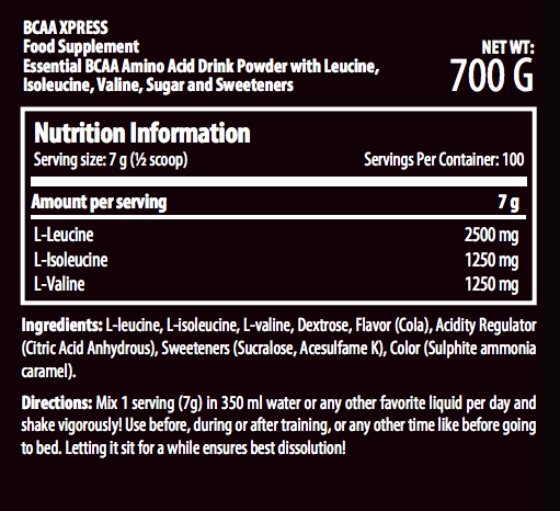 - Pha 1/2 muỗng (7g) BCAA Xpress với khoảng 300 - 350ml nước lọc, whey, mass hoặc đồ uống bạn thích.