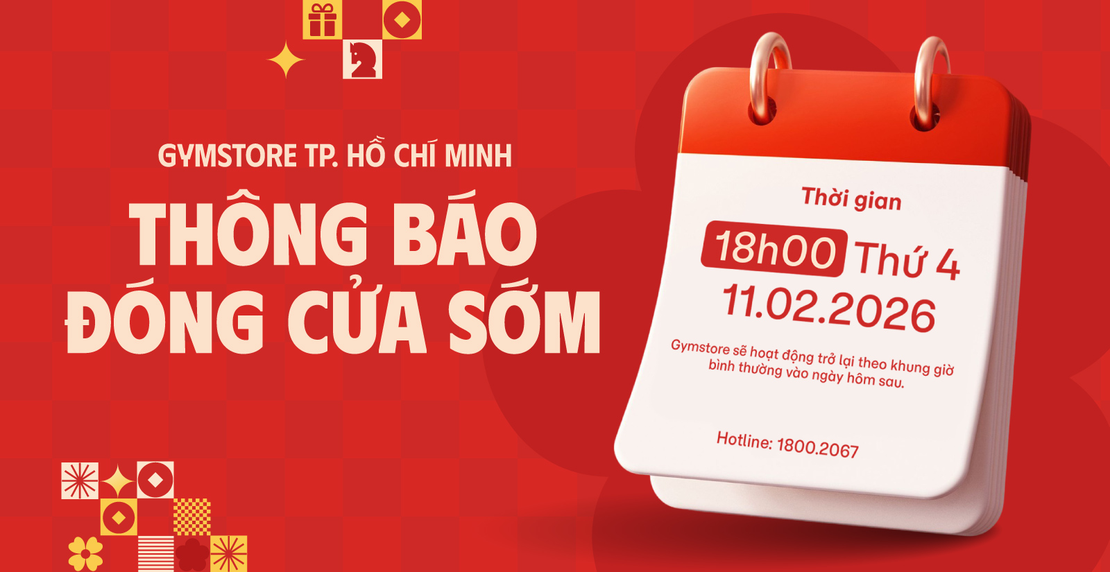 Gymstore TP.Hồ Chí Minh xin trân trọng thông báo về việc thay đổi giờ đóng cửa tại hệ thống 3 chi nhánh như sau: