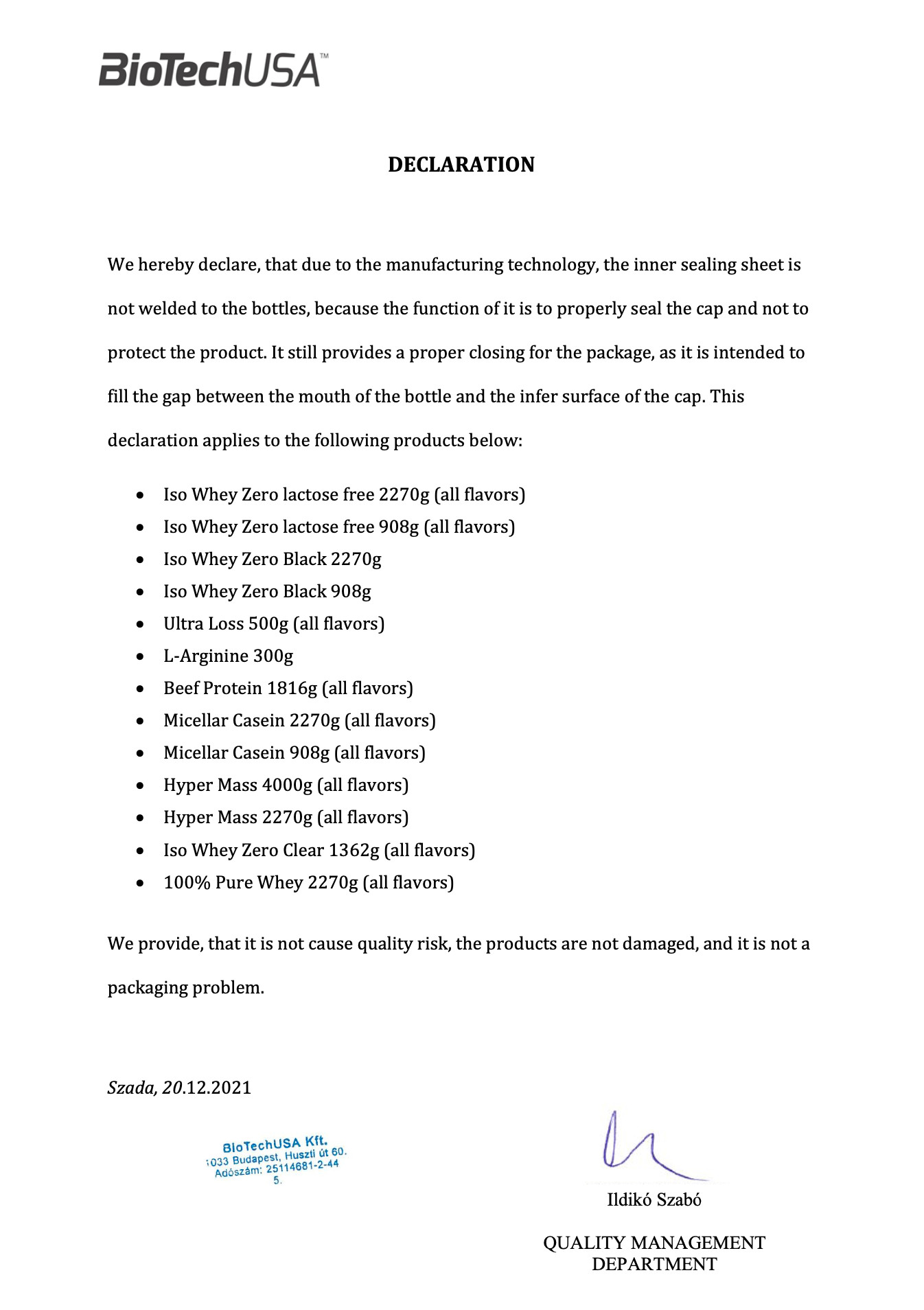 Bên dưới là văn bản từ CEO hãng BioTechUSA công bố về việc SEAL giấy bên dưới nắp sản phẩm sẽ không còn được dính cố định nữa. Bằng văn bản này, thay mặt hãng BioTechUSA, GYMSTORE xin gửi thông báo tới quý khách hàng. Trân trọng!