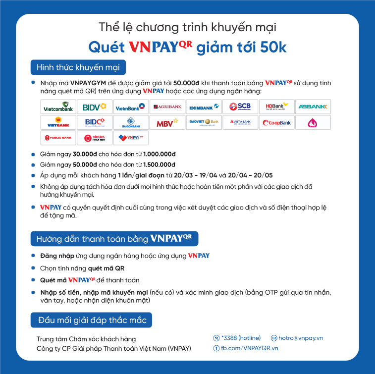 Từ ngày 20/03/2025 - 20/05/2025 tất cả khách hàng mua sản phẩm tại hệ thống Gymstore.vn (cả Online và trực tiếp tại cửa hàng) được hưởng ưu đãi giảm giá khi thanh toán qua ví VNPAY hoặc App ngân hàng có liên kết với VNPAY. Cụ thể: